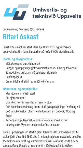 Ritari óskast hjá Umhverfis- og tæknisviði Uppsveita bs.